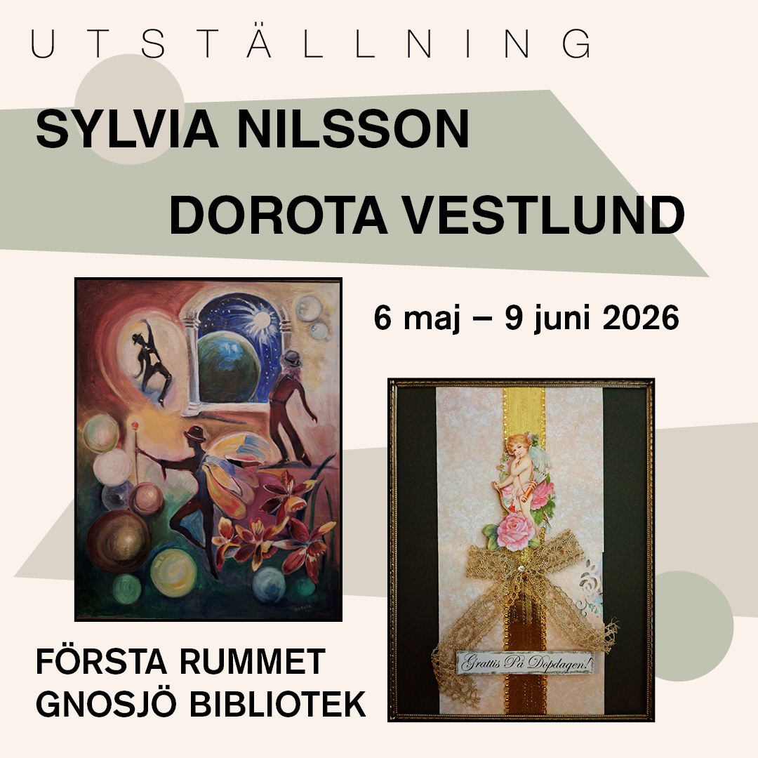 I Dorota Vestlund och Sylvia Nilssons samlingsutställning på Gnosjö bibliotek möter vi två helt olika uttryck. Dorota målar tavlor främst i olja. Varje tavla har en egen berättelse som bygger på egna upplevelser och minnen. Sylvia är hantverkare där blandteknik är ledordet. Hon har svårt att låta saker vara som de är, och vill gärna ge dem en personlig touch. I den här utställningen visar hon främst kort för alla möjliga tillfällen.