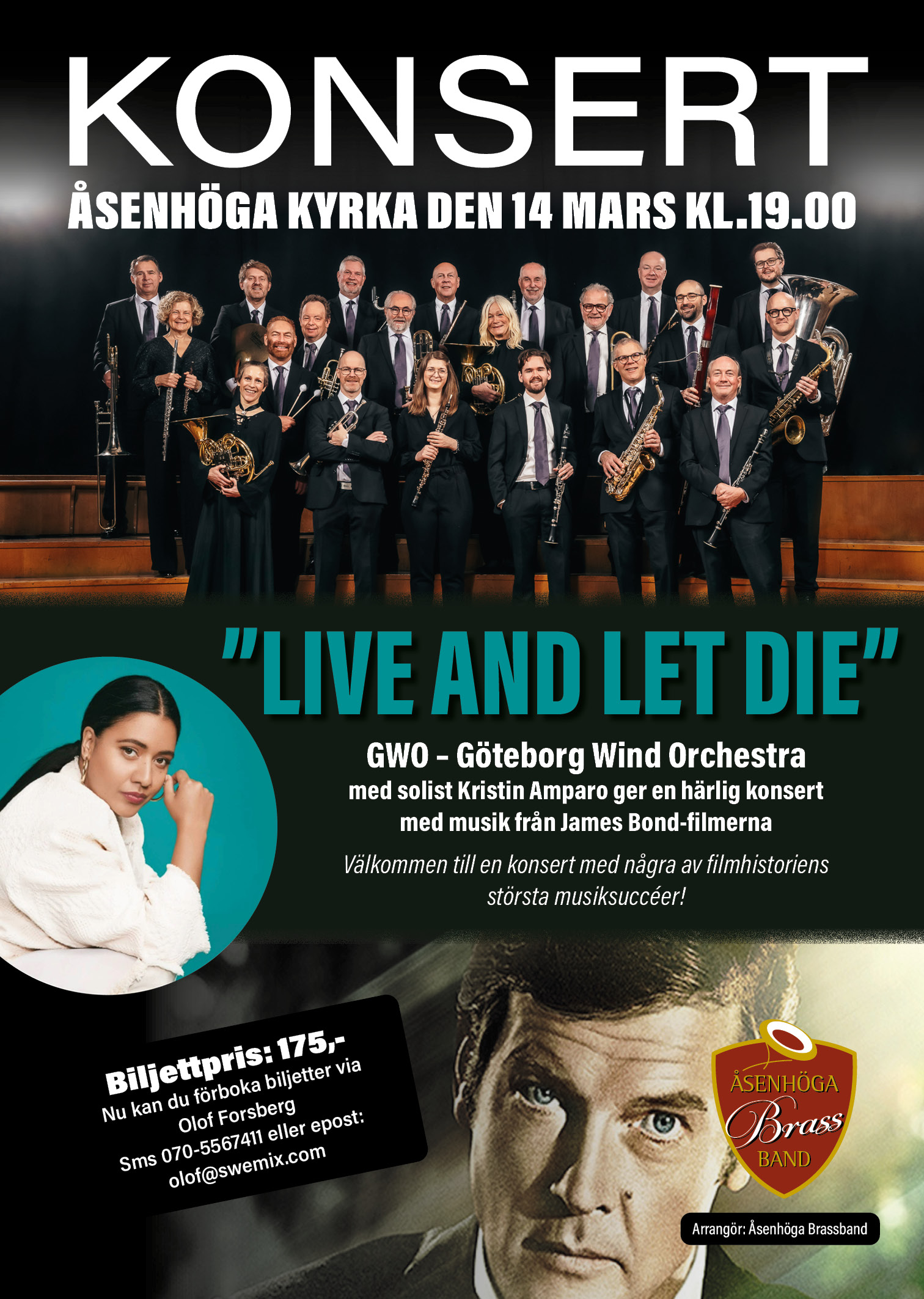 En härlig konsert med musiken från James Bond-filmerna. Välkommen på en bejublad konsert med Göteborg Wind Orchestra (GWO) och fantastiska Kristin Amparo. Åsenhöga kyrka, den 14 mars 19.00.